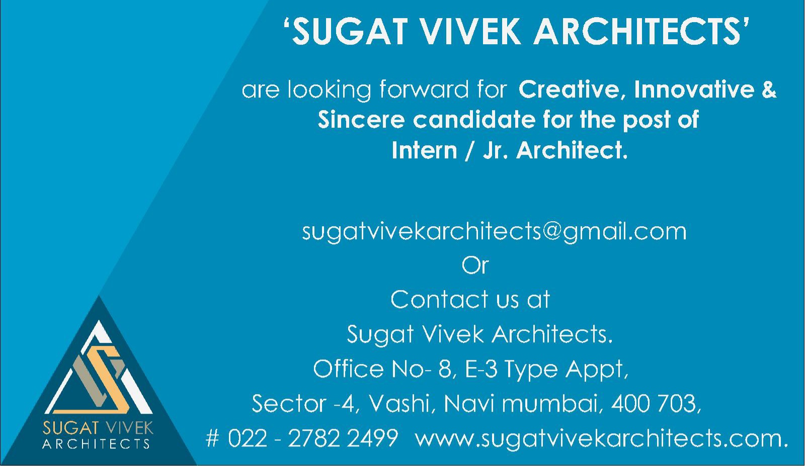 | 1 | Junior Architect | Sugat vivek architects located at vashi navimumbai are hiring junior architects and interns. We mainly deal in residential projects along with industrial, commercial,school,landscape and government projects in municipal councils in raigad region. | 1-2 years | sugatvivekarchitects@gmail.com | .jpg) |
